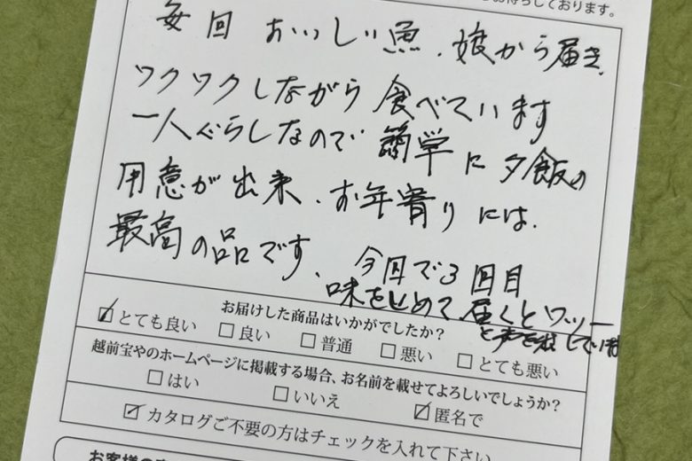 いつも「越前宝や」の品をお召し上がりいただき、ありがとうございます。娘さんからの贈り物が、お一人暮らしの夕食の支度にお役立ていただけていると伺い、大変嬉しく存じます。商品が届くたびに「ワッと」声を出して喜んでいただけているとのこと、私どもにとって何よりの励みになります。これからも、食卓に「わくわく」をお届けできるよう、心を込めて美味しい魚をお届けしてまいります。